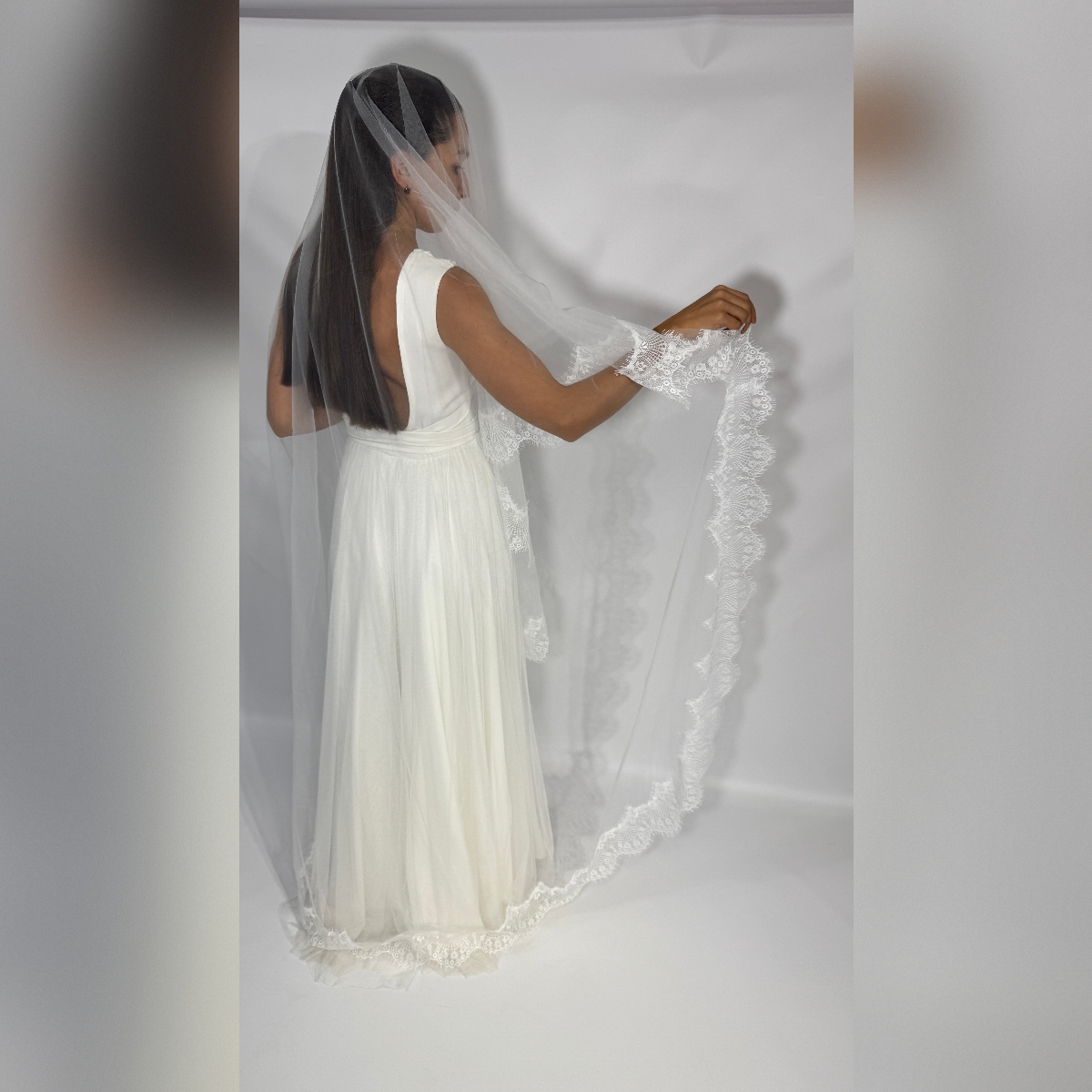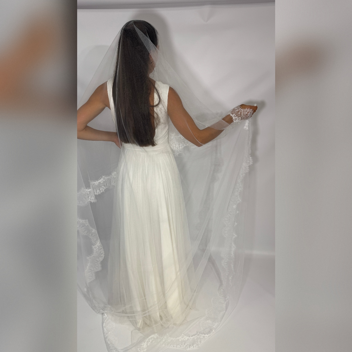 Весільна фата з мереживом — витончений аксесуар для нареченої, що цінує елегантність у кожній деталі. Легка напівпрозора тканина підкреслює ніжність образу, а мереживний край створює бездоганний контур та ефект плавного, м’якого силуету. Фата чудово поєднується з мереживними, мінімалістичними та атласними сукнями, гармонійно завершуючи весільний стиль. Підходить для фотосесії, церемонії та урочистої частини.