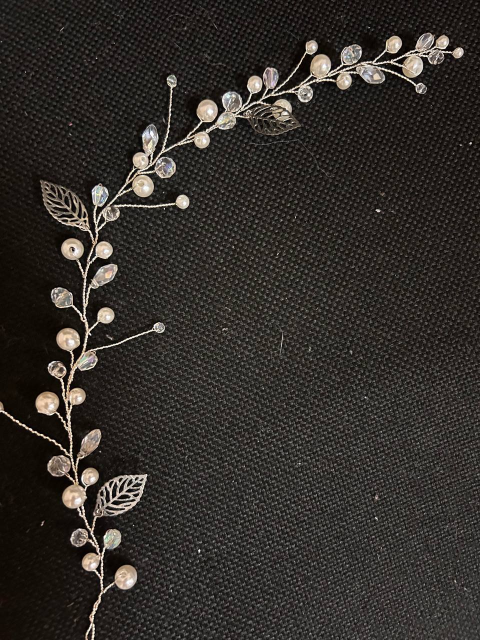 Вишукана весільна гілочка для волосся довжиною 35 см, оздоблена перлами та кришталем. Гнучкий дизайн дозволяє легко створювати різні варіанти зачісок, додаючи образу нареченої ніжності та сяйва.