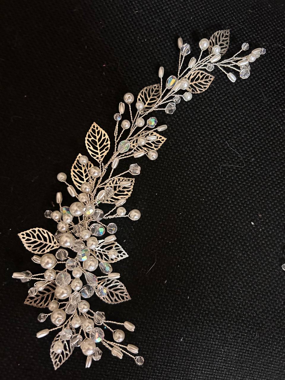 Вишукана весільна гілочка для волосся довжиною 35 см, оздоблена перлами та кришталем. Гнучкий дизайн дозволяє легко створювати різні варіанти зачісок, додаючи образу нареченої ніжності та сяйва.