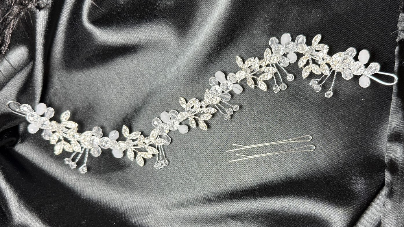 Вишуканий весільний віночок, оздоблений блискучими кристалами та прозорим кришталем. Легкий і зручний у носінні, він ідеально доповнить зачіску нареченої, надаючи образу сяйва та елегантності.