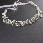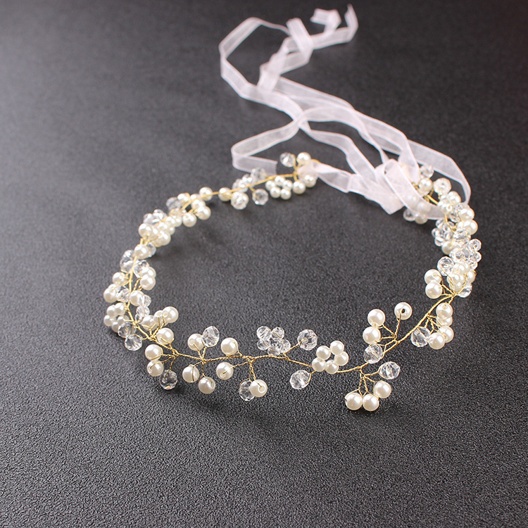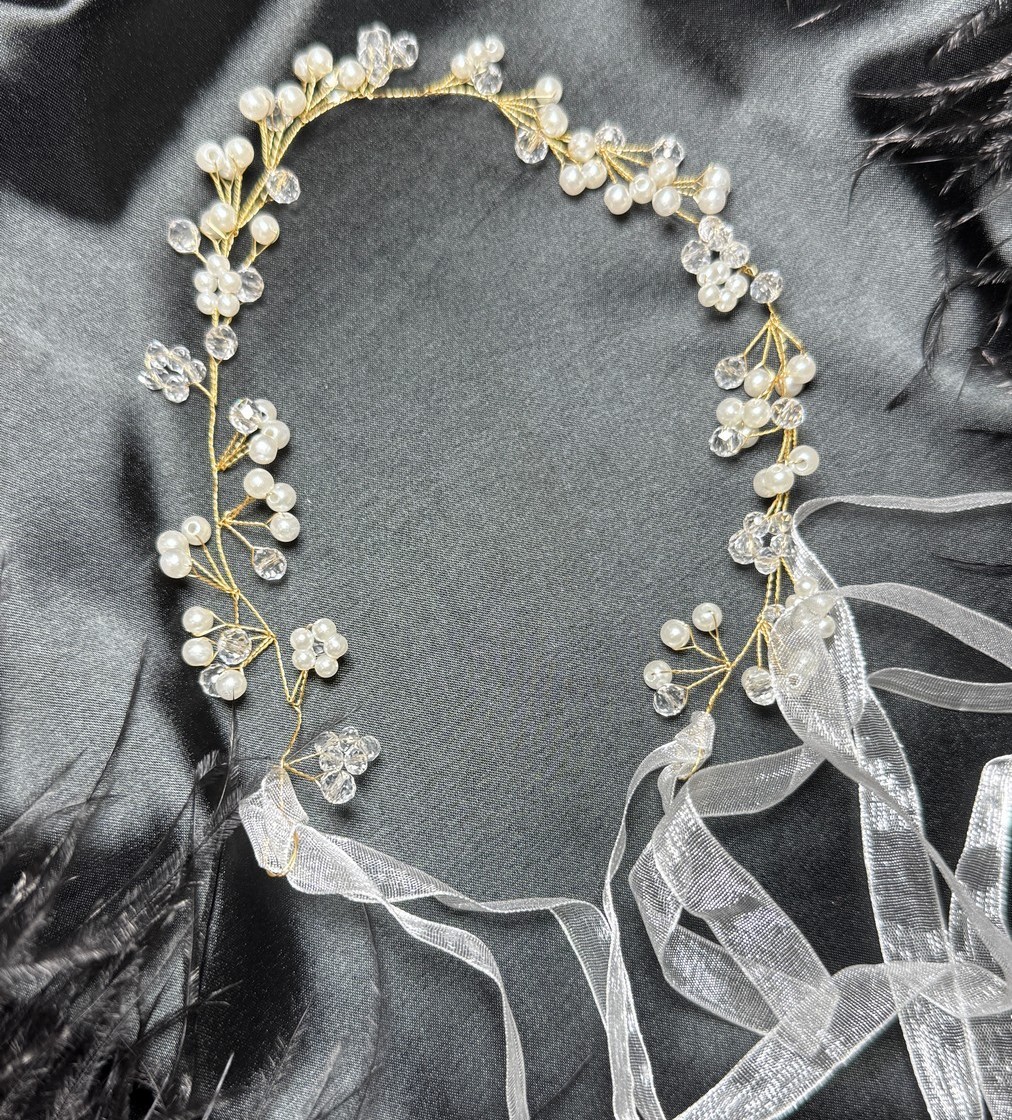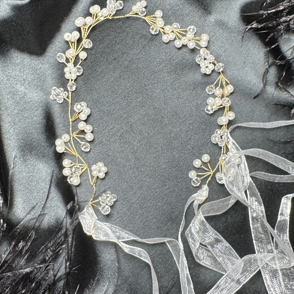 Ніжний весільний віночок із перлами та кристалами, доповнений елегантною стрічкою для зручної фіксації. Витончений дизайн додає образу нареченої романтичності та сяйва, ідеально підходить для весілля чи фотосесії.