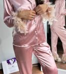 Рожева шовкова піжама для дружок нареченої — розкіш і стиль у кожній деталі. Оздоблена пишним пір’ям індика, створює святковий настрій. Ідеальна для фотосесій і вечірки нареченої.