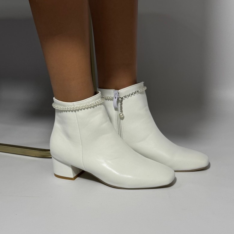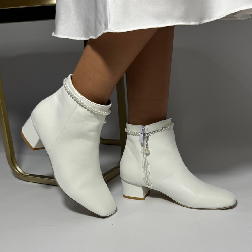 Весільні ботильйони, чобітки з круглим носиком з єкошкірі з ремінцем перли (знімається) 4см