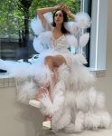Весільний пеньюар, прикрашений квітами, виготовлений вручну — це справжній витвір мистецтва. Кожна квітка на цьому розкішному виробі була ретельно створена і закріплена з великою увагою до деталей, щоб підкреслити ніжність і елегантність нареченої. Цей шикарний пеньюар поєднує в собі вишуканість та романтичність, роблячи образ нареченої неймовірно вражаючим. Він підкреслить найважливіші моменти дня, даруючи відчуття розкоші та комфорту.