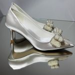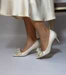 Весільні атласні туфлі з елегантними бантами та перлами. Вишуканий дизайн для нареченої, висота підборів 7,5 см. Ідеальні для особливого дня – зручні, стильні, розкішні.