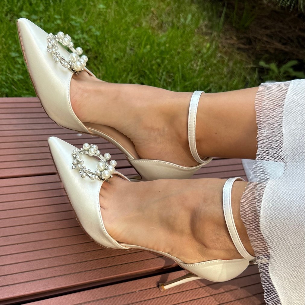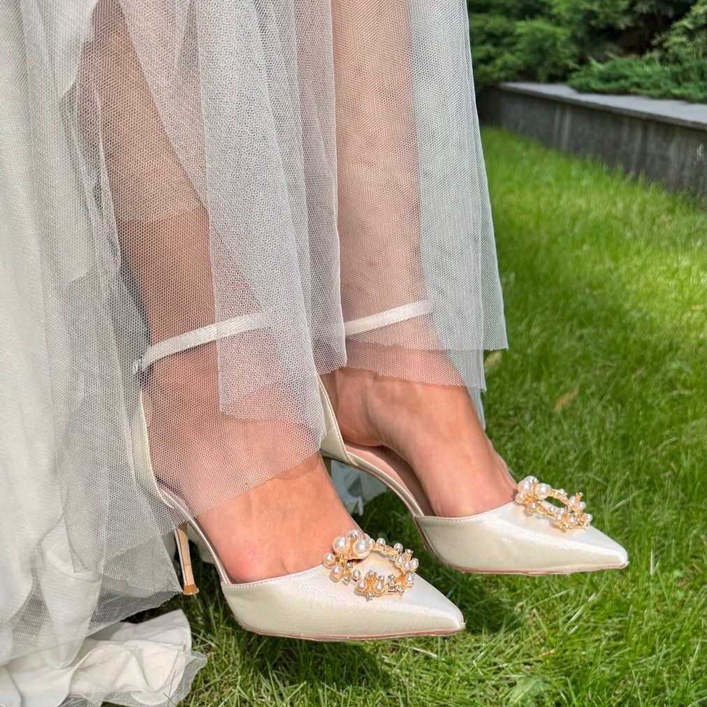 Атласні весільні туфлі з елегантною брошкою з перлів. У комплекті ремінець сатиновий — для створення індивідуального стилю. 6 образів в одному: змінюй ремінці та брошку під настрій. Ідеальний вибір для витонченої нареченої.