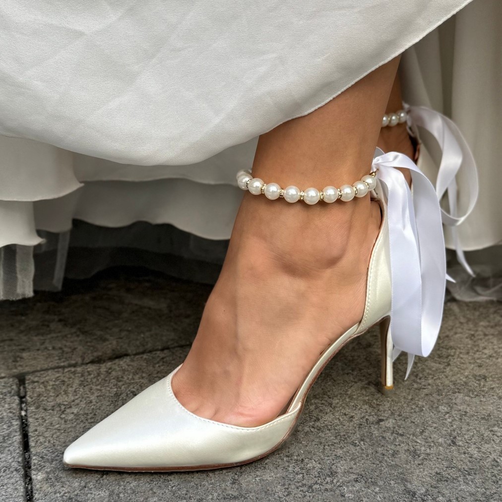 Атласні весільні туфлі з елегантною брошкою з перлів. У комплекті ремінець сатиновий — для створення індивідуального стилю. 6 образів в одному: змінюй ремінці та брошку під настрій. Ідеальний вибір для витонченої нареченої.