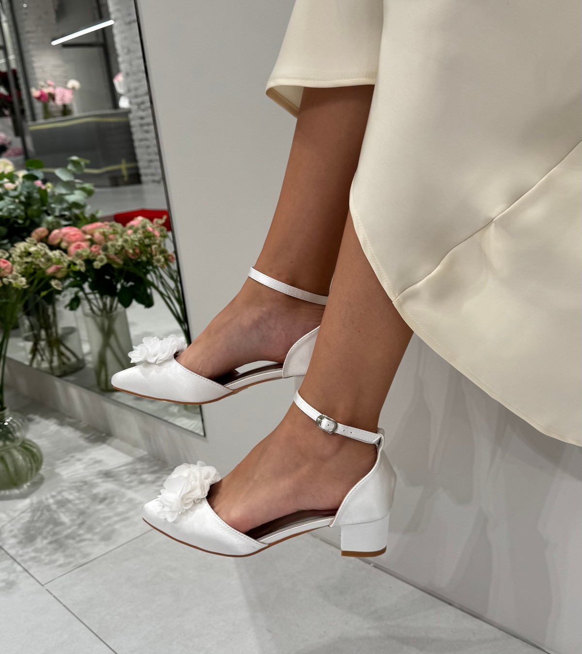 Весільні атласні жіночі туфлі на стійких квадратних підборах 4 см — ідеальне поєднання комфорту та стилю. Два образи в одному: знімна брошка у формі квітів створює акцент, а без неї взуття набуває лаконічного вигляду. Ідеальний вибір для нареченої.