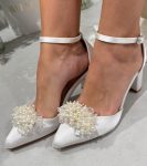 Весільні атласні жіночі туфлі на зручних квадратних підборах 7 см — витончений баланс стилю та комфорту. Два образи в одному: знімна брошка з перлами додає сяйва, а без неї туфлі виглядають стримано й елегантно.