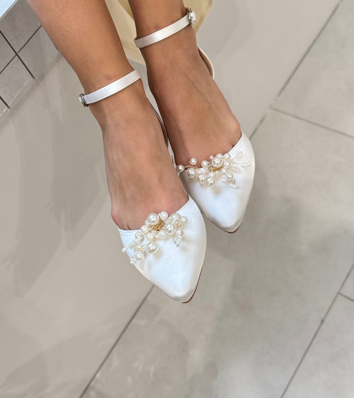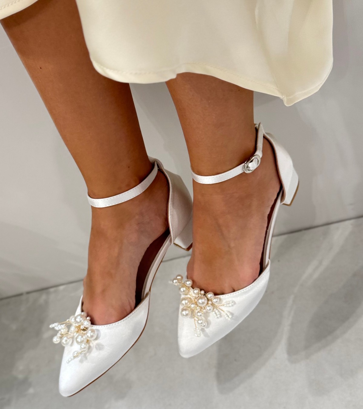 Весільні атласні жіночі туфлі на зручних квадратних підборах 4 см — витончений баланс стилю та комфорту. Два образи в одному: знімна брошка з перлами додає сяйва, а без неї туфлі виглядають стримано й елегантно.