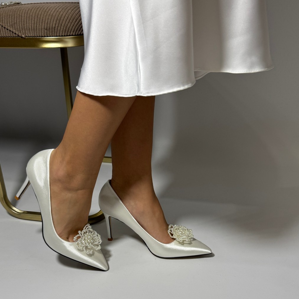 Жіночі туфлі весільні атласні закриті класичні з брошкою перли квітка 7 см