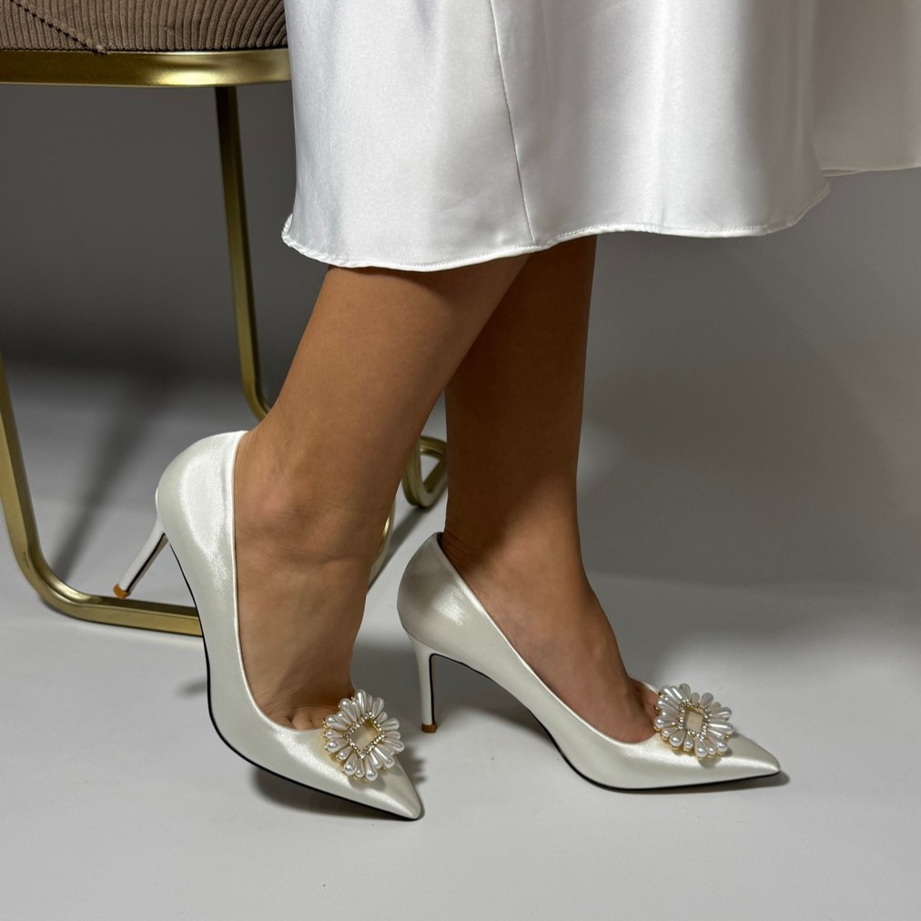 Жіночі туфлі весільні атласні закриті класичні 9 см ( колір айворі ), з брошкою на вибір золота або срібна